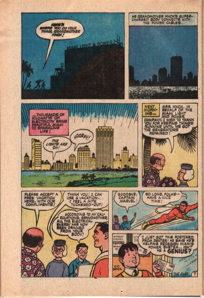 And once again, the solution comes from a total coincidence. It turns out that Miami, Florida is suffering from a brown-out, so Captain Marvel takes Dexter’s grandmother there (by train rather than flying because grandma is afraid of flying) and she lights up the entire city until the power can be restored. And this effort exhausts the electrical energy that she was charged with to begin with. So everything comes out okay. But again, Captain Marvel and Billy Batson are practically incidental in the story and the wrap-up. It’s hard to imagine that Schwartz or his writers were working especially hard on these short tails. There’s an ineffable sense that they were looking down on the material and on those who might like it, feeling it not worth their best efforts. Whether that’s projection or reality, the fact remains that the story work in SHAZAM at this time was weak stuff.