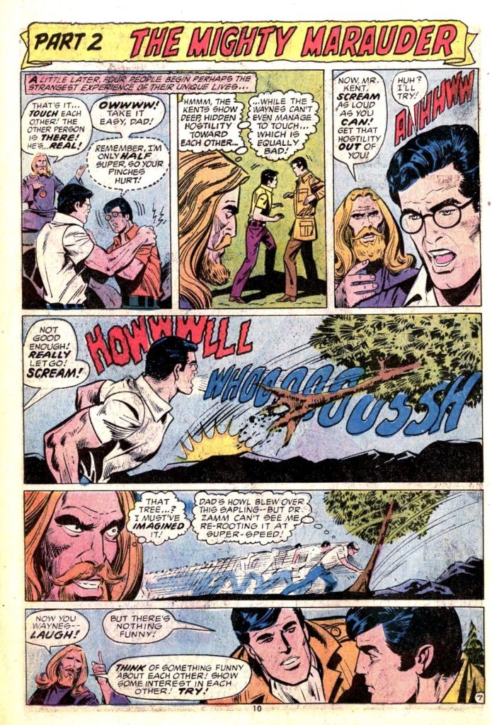 The story is about Clark Jr and Bruce Jr as well as their fathers infiltrating Enoyreve “encounter camp” designed to bring estranged families closer together. They’re working to locate a rogue cyborg government agent before he can unleash a deadly nerve gas on a populated area. This is all made more complicated due to the fact that the guru of the camp, Dr. Zamm, has determined that each of the Super-sons would be better off with the other father, and has caused them to pair off in that fashion. It’s all carried off in writer Bob Haney’s typically tone-deaf style, simultaneously attempting to accurately represent the point of view of the younger generation while also being unable to resist sneering at it a little bit along the way.