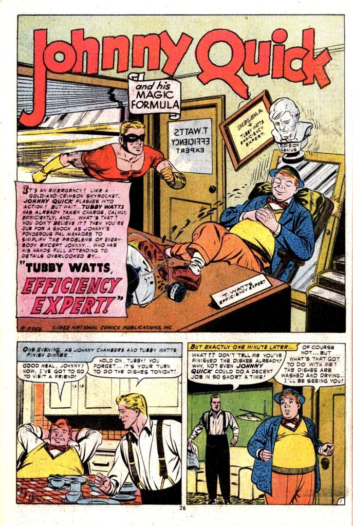 The balance of the issue was classic reprints, which tended to be the thing that I liked most. This one, though, was a bit of a mixed bag. Nothing was terrible, but a lot of it was simply there. Case in point, the short Johnny Quick story that comes up next. Produced by Don Cameron and Ralph Mayo, it’s about Johnny’s buddy Tubby Watts becoming an efficiency expert and consequently screwing up Johnny’s crime-fighting efforts. Given my love for the Flash and speedsters in general, I should by all accounts have liked Johnny Quick, especially given that his stories were usually better crafted than contemporaneous Flash tales. But somehow, the strip usually left me cold, and this outing was no exception.