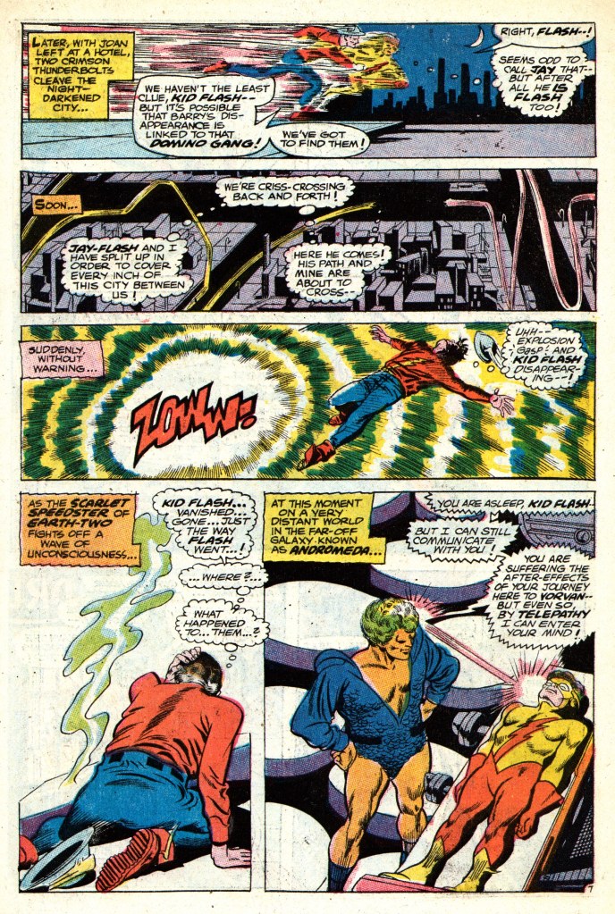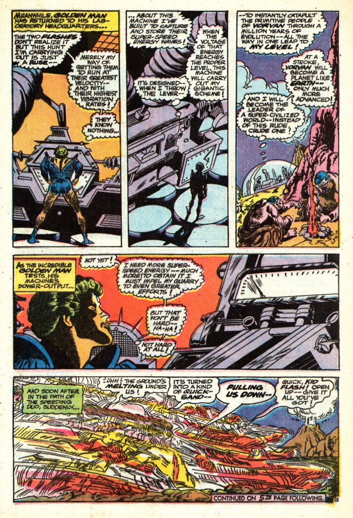 The Golden Man is a mutant born on a primitive world with telepathic and telekinetic powers a thousand years more advanced than his own kind. He tells the Flashes that he’s grown bored being the only intelligent being on his homeworld of Vorvan. So, to entertain himself, he wants to play out a Most Dangerous Game hunt where he’ll pursue the two speedsters across the planet, attempting to kill them. If they can remain alive for the equivalent of four hours, he’ll relent and return them to Earth. Unbeknownst to the Flashes, what the Golden Man is really trying to do is to capture their super-speed energy, which he believes he can use to hyper-evolve the rest of his primitive people. Now, why the Golden Man doesn’t just tell the Flashes this and ask for their help is a mystery–for a hyper-evolved being, he doesn’t really seem all that smart. So the Flashes run a mad race across Vorvan, encountering danger from the local flora and fauna and pursued by the Golden Man. Trapped in quicksand, the Flash appears to sacrifice himself to get Kid Flash to safety. But the Golden Man still needs more super-speed energy.