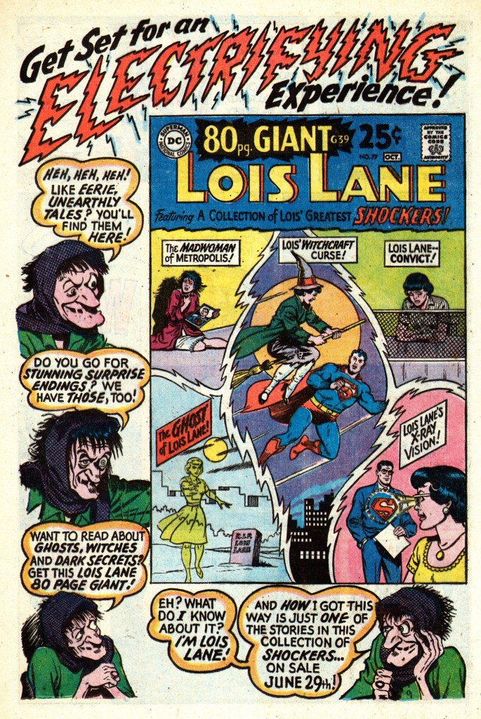 A pause here for a full page house ad promoting the latest 80-Page Giant issue of SUPERMAN’S GIRL FRIEND LOIS LANE, this one dedicated to the girl reporter’s most shocking stories. Which turned out to be something of a loose guiding principle, but it still allowed for another conglomeration of cool Lois stories from the past.