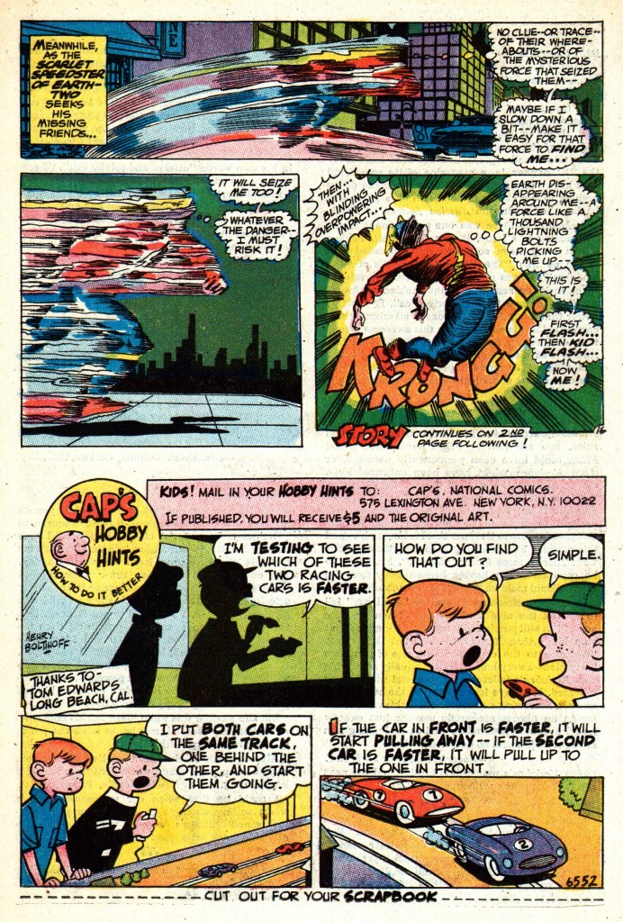 On that same trip to Ed’s Coins and Stamps in the Sun-Vet Mall courtesy of my accommodating grandparents, I also purchased a back issue of THE FLASH, one of my favorite series. Ed had a decent stock of back issues of the title at reasonable prices, so I flipped through them and landed on this one. It promised a team-up between the three primary Flash characters, which is what made me pick it up. The panel-oriented cover was also eye-catching. Laying out innovative covers such as this one was one of the attributes that got artist Carmine Infantino noticed by the brass, and he’d very shortly be made Editorial Director of DC’s comic book division. He’d only draw one more issue of FLASH after this one, at least until the 1980s.