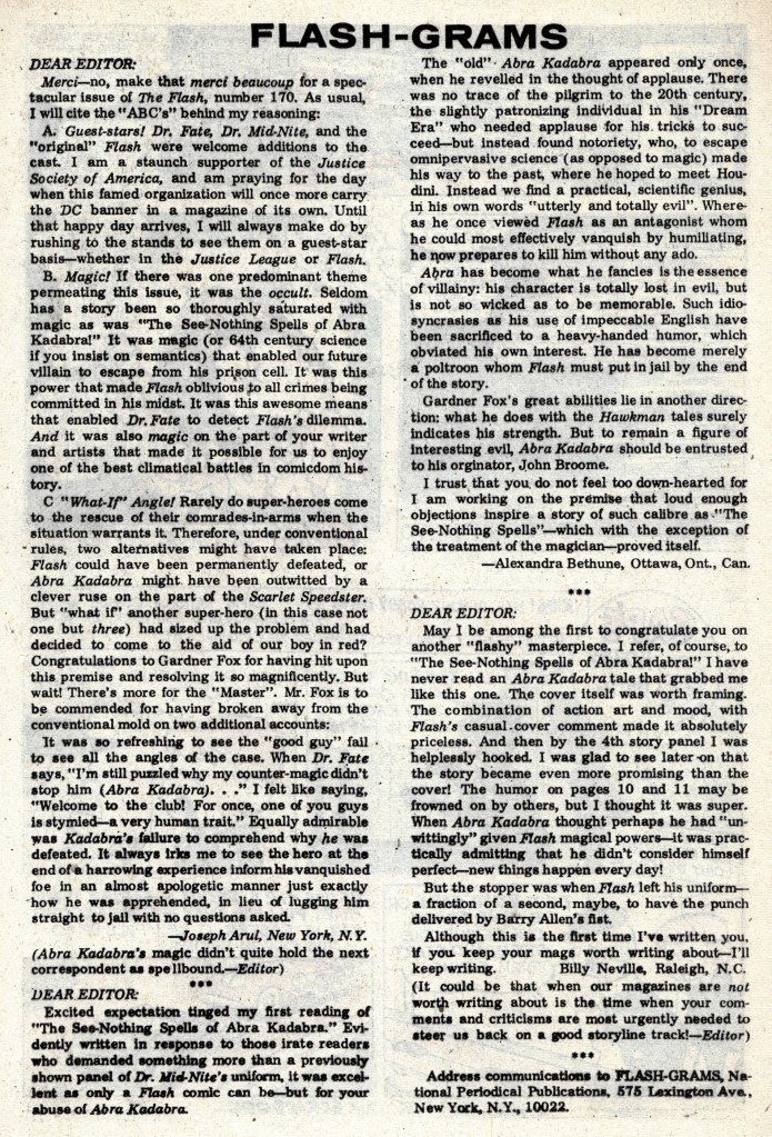 The issue’s Flash-Grams letters page appears at this point. As these things go, it’s a relatively sedate version of the feature, with editor Schwartz keeping his replies to a minimum.