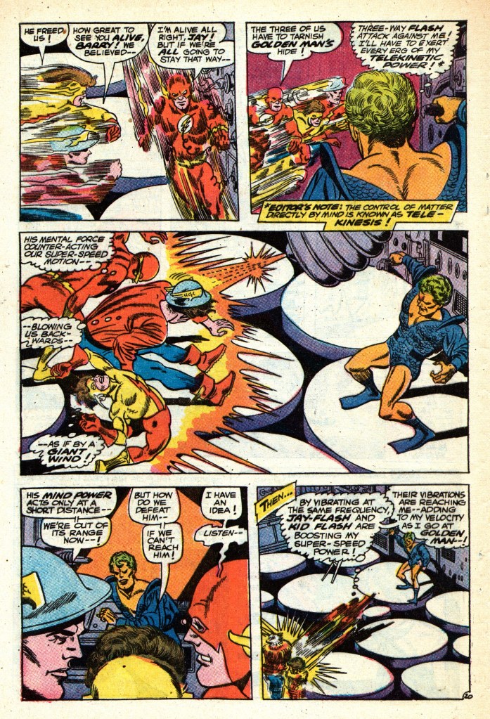 Fortunately for the Golden Man, he detects the activity of another speedster on Earth: Jay Garrick, who is attempting to duplicate what happened to Barry and Wally previously. The Golden Man zaps Jay to Vorvan, then after a quick tussle, sets him and Kid Flash up in a sub-zero field, requiring them to vibrate themselves at super-speed to keep from freezing solid. In this way, he hopes to harness the energies he needs. But his scheme is foiled by the arrival of Barry Allen, who had escaped the quicksand by vibrating himself downward, through the whole planet. Barry is able to free the others, and now the three Flashes assault the Golden Man in tandem, overwhelming his mind over matter powers.
