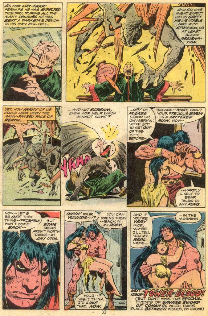So we get to the action portion of the issue, as Conan battles the four-armed gargoyle. And he puts up enough of a fight that he breaks the concentration of Lun-Faar. Freed from the sorcerer’s influence, the gargoyle, which had been imprisoned in the form of a stone statue, races back to the merchant’s shop and promptly disposes of Lun-Faar. Having been liberated from both death and blackmail, Arlinna seems more than happy to go to bed with Conan at the story’s end, which is framed as a happy ending. But it’s all pretty messy, and didn’t make me any more interested in following Conan’s exploits, sexual or otherwise, further.
