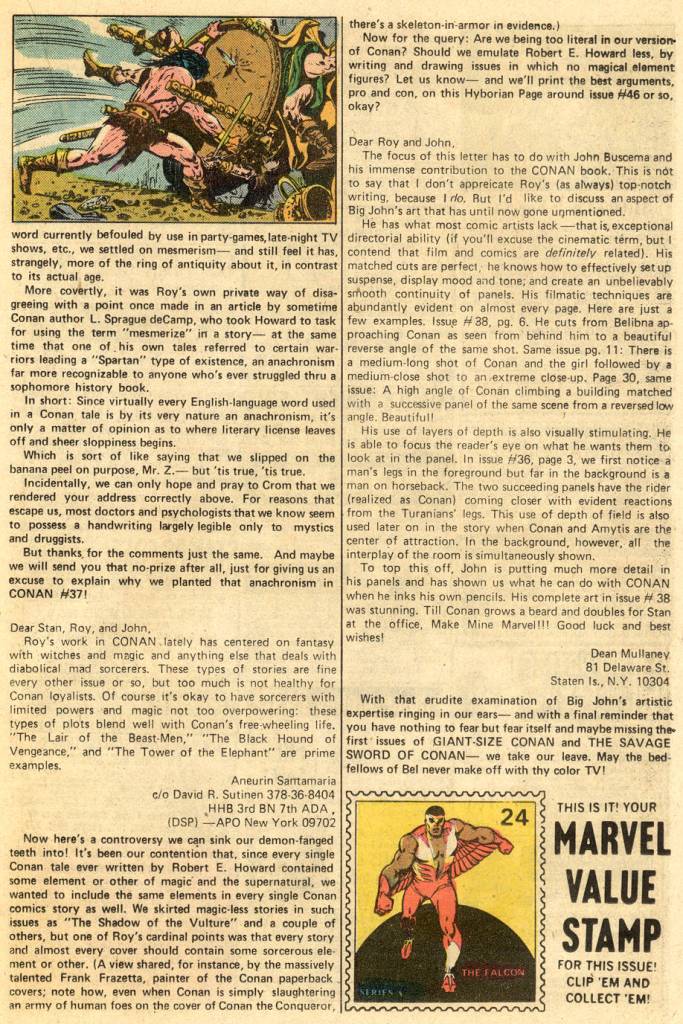 A pause here for the second half of this issue’s two-page The Hyborean Page letters pages, which carried a missive from future Eclipse Comics founder Dean Mullaney. It focuses heavily on the artwork of John Buscema and analyzes the techniques that he brings to bear on the series every issue. The book also included a Marvel Value Stamp featuring the Falcon, which was thankfully intact in this copy. Those Value Stamps are the bane of collectors, as many of them were clipped from the issues, resulting in a flaw that can’t be immediately detected in bagged back issues.