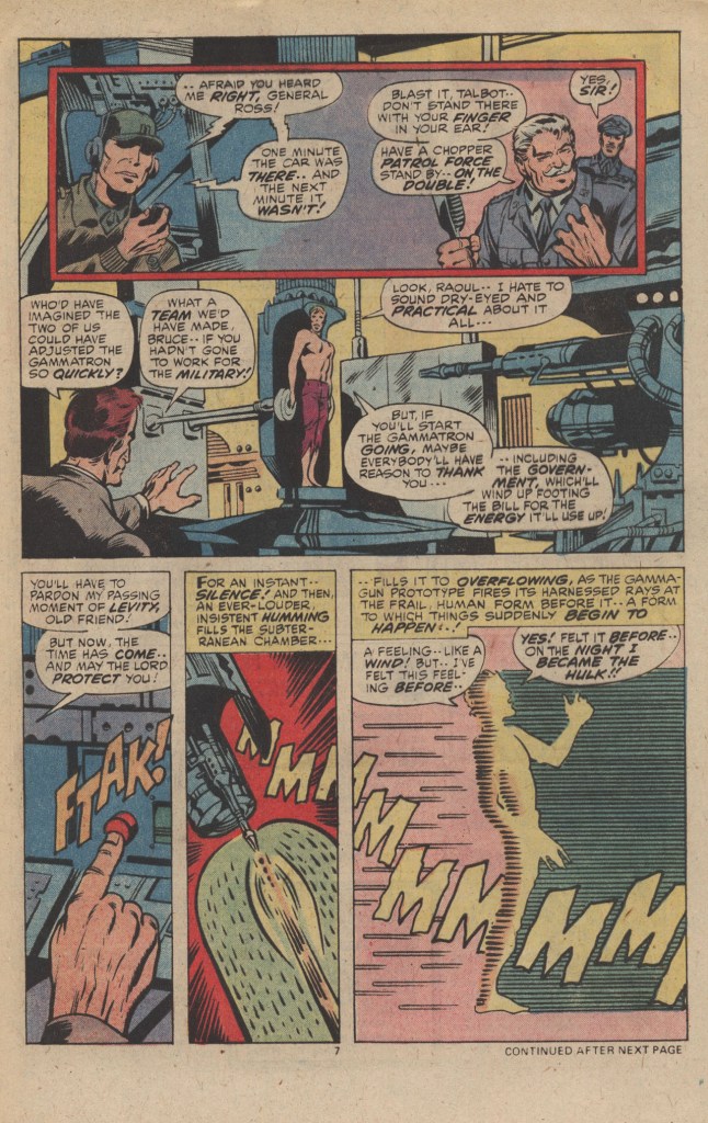 The pair head out to Stoddard’s concealed experimental laboratory, all the while watched by a spotter plane sent by the military. Moving quickly, the two men set up Banner’s latest breakthrough and bombard him with an additional dose of gamma radiation. This is meant to suppress his Hulk side, but instead it has an unintended consequence. In the manner of comic book scientist, rather than submerging the Hulk’s persona, the bombardment instead separates the titan from Banner’s body, incarnating him in a complete separate form. So Banner and the Hulk have now been split into two discrete beings.