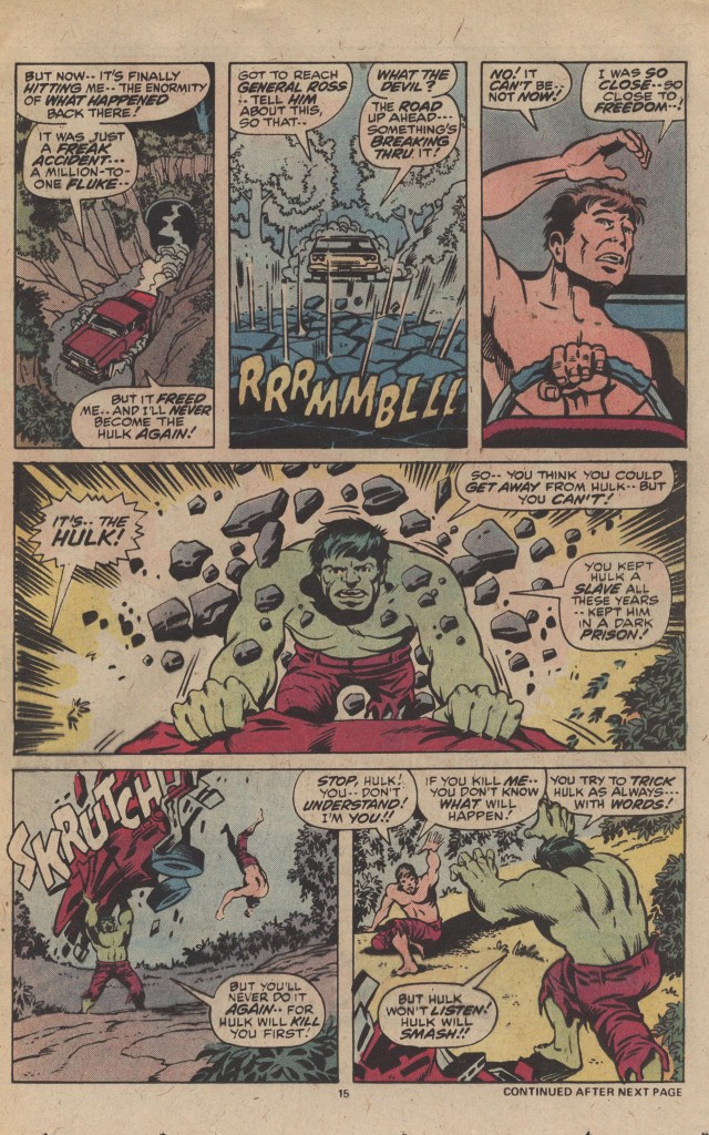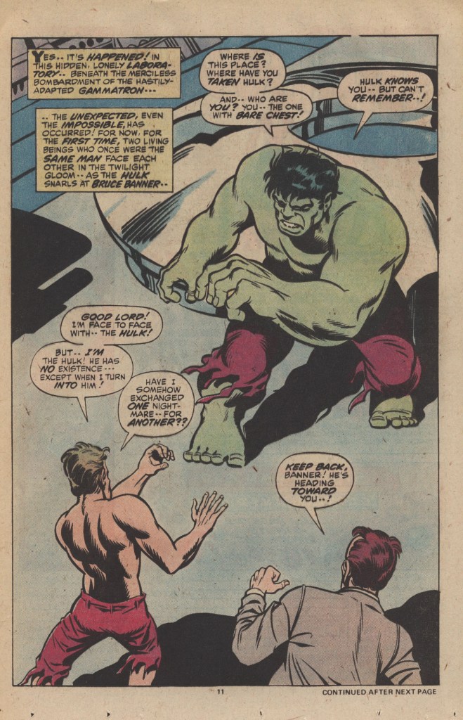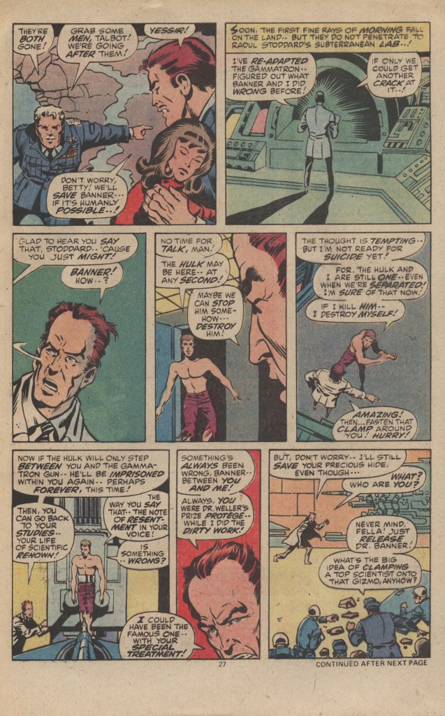 Realizing that he’s just as connected to his alter ego as he ever was, and that he’s the cause of all of the carnage that’s going on, Banner realizes that he and the Hulk must be reunited. So he grabs a nearby car and heads back out towards Stoddard’s lab, with the Hulk close behind him. Stoddard, meanwhile, has figured out the mistake that was made earlier, and so he’s prepared to take another shot at it when Banner reappears in his lab. But it turns out that Stoddard has been jealous of Banner all this time, and sees this as the opportunity to get rid of his rival. (He wasn’t smart enough to simply say that he hadn’t worked out a way to reverse the process and just let the Hulk do his dirty work for him, though.)