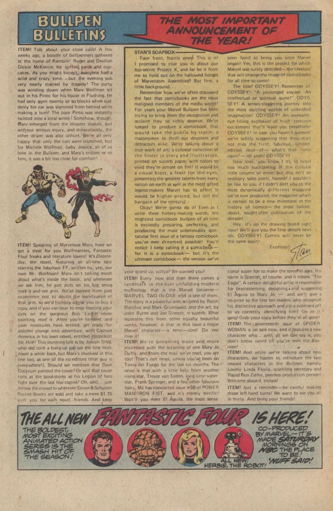 This issue also debuted the new month’s edition of the Bullpen Bulletins page. I loved getting the inside scoop on what was coming up in the Marvel books, so I inevitably devoured these pages when they first showed up. This time out, Stan Lee declares in his Soapbox column that the company’s upcoming HEAVY METAL-style magazine was going to be called ODYSSEY. Unfortunately, it turned out that some other publisher had a trademark on the name ODYSSEY, which forced Marvel to pivot to calling the publication EPIC ILLUSTRATED instead. It also chronicles a car accident that writer Marv Wolfman had gotten into, which seems like a strange thing to devote space to, but which certainly made the people mentioned feel more like regular old human beings to me.