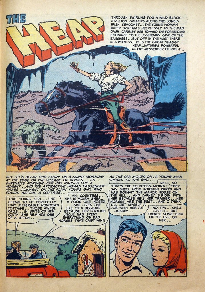 The story was written years before pop culture got its most enduring taste of a horse-pookah, Disney’s 1959 DARBY O’GILL. However, that movie adapted stories from two tale-collections from the early 20th century- so IF there’s a horse-pookah in any of them, that might’ve been what the unbilled writer was drawing upon– even though I admit the word “pookah” never appears in the Heap story. Equally possible that there was some other source for this writer’s suggestion of a dangerous horse-spirit.