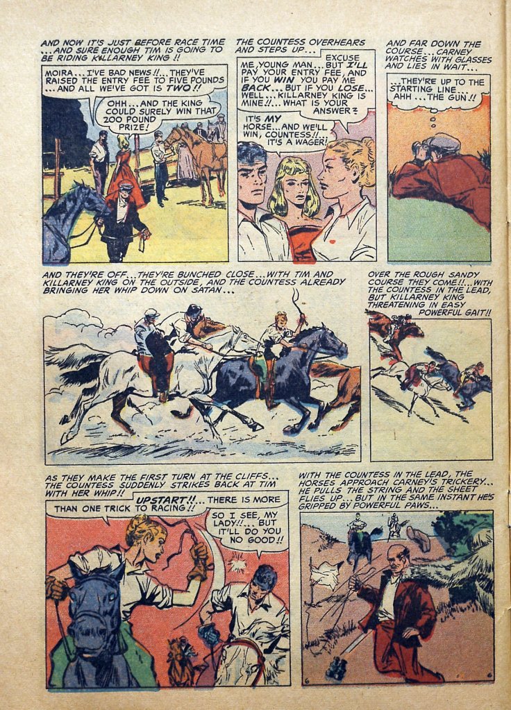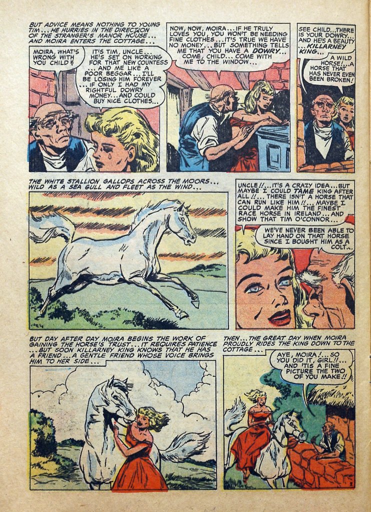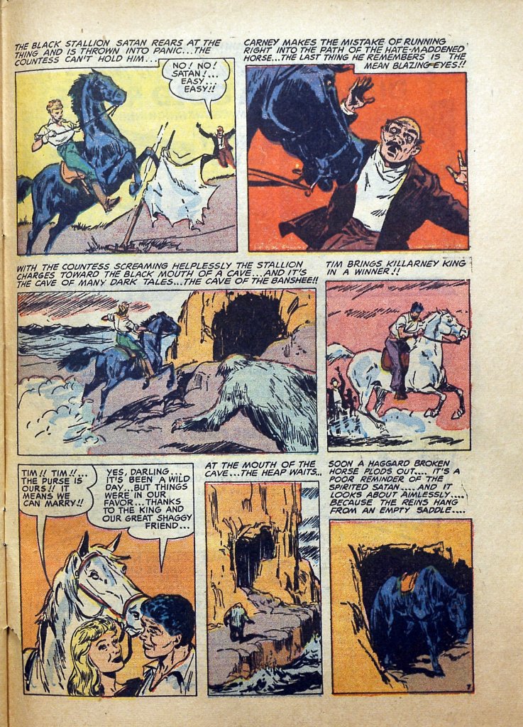 The opening caption, with its allusion to a “cave of the banshees,” made me think that we were going to see something based on the Irish legend of the pookah, a spirit that sometimes takes the form of a horse to beguile mortals to their doom. The horse does convey a sense of the uncanny, though it really is just a mortal animal. But then the story takes an interesting turn, as it’s the Good Poor Girl’s competition, the Bad Rich Girl, who disappears into said cave, with no rational explanation as such.