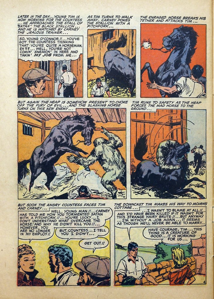 And it looks like there was some editorial meddling along the way. The Heap grabs one of the bad guys — to absolutely no effect, because he’s free in the very next panel to get trampled to death (we assume, off-panel) by the horse. And then the horse runs into a convenient cave on the moors that has nothing to do with the plot where something awful (we assume, off-panel) happens to the other bad guy and the horse.