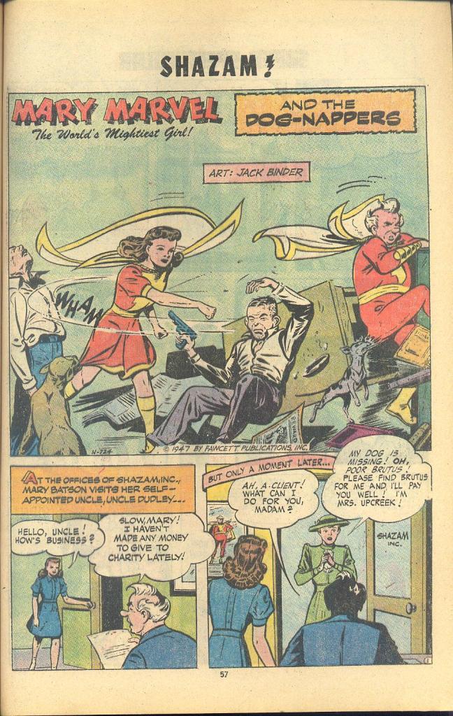 The next tale was also new to me, and featured Mary Marvel and Uncle Dudly, and was produced by Otto Binder again, this time paired with his brother Jack Binder as the artist. Jack ran a shop for comic book production during the wartime years that produced a lot of material for Fawcett, including a bunch of Marvel stories. It’s a pleasant enough little tale concerning Mary and Dudley’s efforts to reunite a missing dog with its owner, running afoul of a dognapping ring along the way. Much of the fun is in seeing Uncle Marvel bluff and stumble his way from one predicament to the next, given that his SHAZAM powers are all a put-on. And Mary, of course, keeps events from growing too dire.