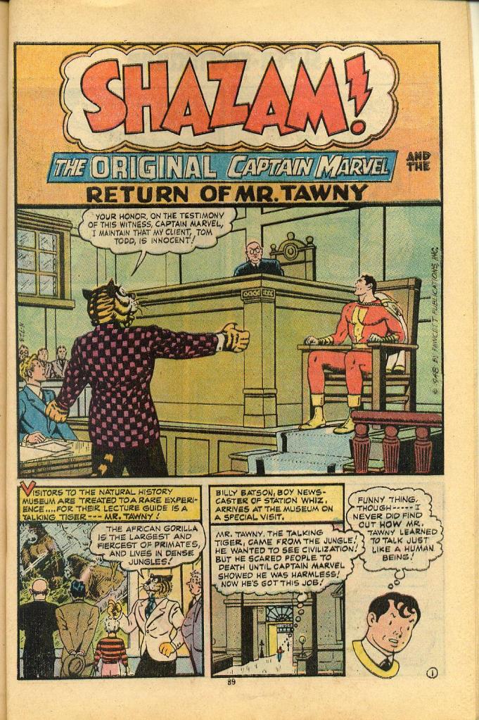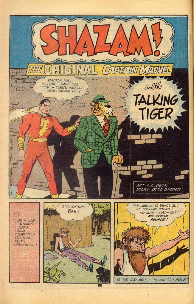 The next story reprinted was the debut of Mr. Tawny, the talking humanoid tiger who became a fixture in the Captain Marvel strip for its final five years or so. Creator Otto Binder clearly loved the idea of Tawny and his ability to comment upon human foibles, and he even planned a possible newspaper comic strip featuring the tiger to be drawn by his collaborator C. C. Beck. The strip didn’t wind up selling, but Binder got a lot of mileage out of the character in his Captain Marvel stories. In this first story, the manner in which Tawny became able to talk and think like a human being was left a mystery–he could simply do it, and so crossed Captain Marvel’s path when he attempted to enter human civilization.