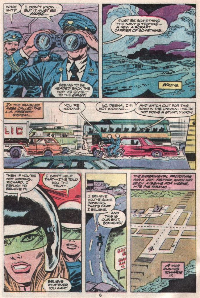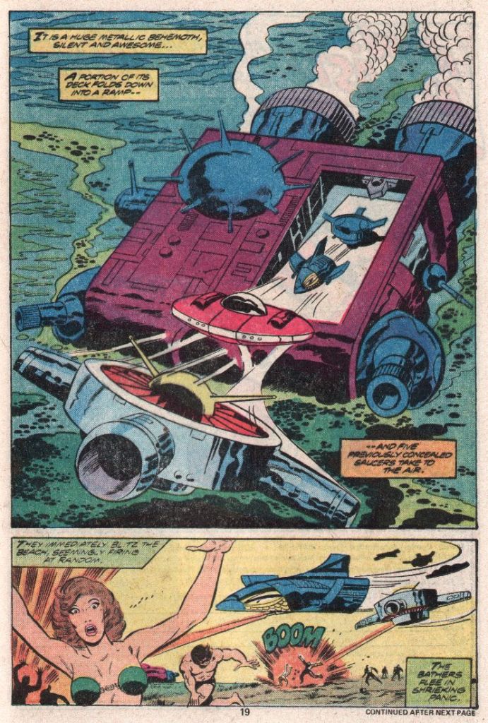 As the issue reaches its climax, Raydeen is able to dislodge the five-ship headpiece from the attacking carrier with his thrown concussion shield. But as Richard and Deena watch, the five ships separate and then reassemble into a different configuration–one that looks somehow even more dangerous than the first. And that’s where this issue is To Be Continued. The carrier is called Cerberus, as we learn from Doug Moench’s narrative captions, though no character ever gets to speak that name. And what it’s after or why it’s here and who is controlling it all remain a mystery to be solved next issue. Consequently, as a story this is relatively thin stuff–most of the effort seems to have been put into attempting to characterize and humanize the three pilots, particularly Richard Carson. But I totally understand why the events of this issue left my brain.