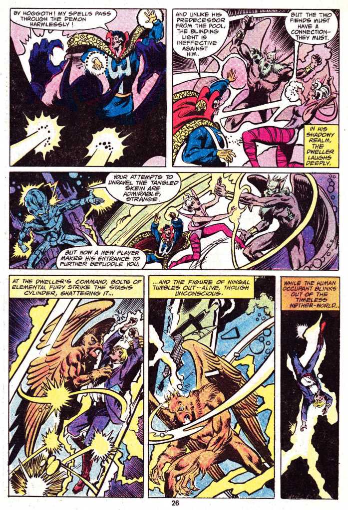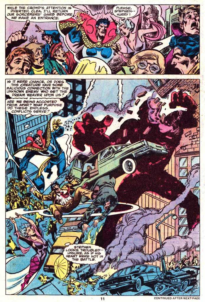So even as Strange and Clea take care of the menace of the first transformed pedestrian, they find themselves suddenly set upon also by Ludi, whom the Dweller In Darkness has transported to the battlefield. Meanwhile, the Dweller turns his attention to the time-frozen form of Ningal. He produces a spell to shatter Ningal’s prison, but doing so also frees Murdoch, who winds up falling through a mystic portal and arriving back in Earth. Ludi, it turns out, is a more formidable opponent than the earlier monster, and Strange and Clea are decidedly on the back foot. Ludi prepares to tear Strange’s soul from his body when Clea gets an idea.