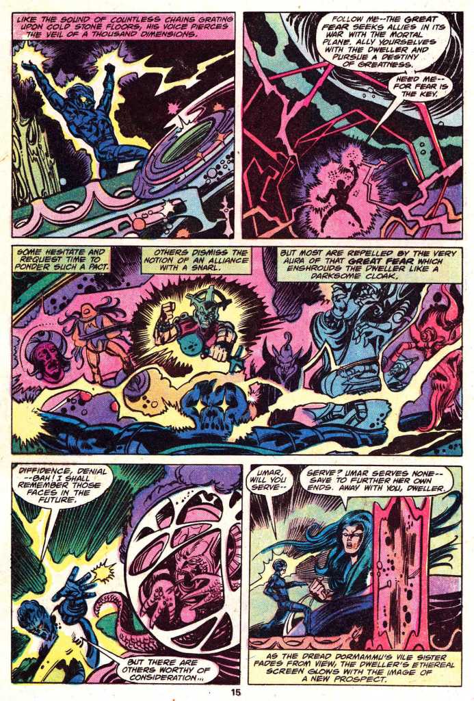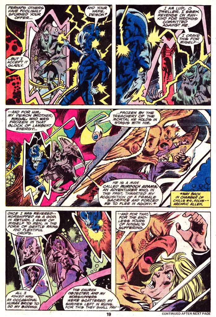 The Dweller, realizing that his makeshift menace isn’t going to be able to stand up against the Sorcerer Supreme for very long, goes seeking allies, and this gives Roger and Ralph a chance to check in on assorted previously-introduced foes of Doctor Strange momentarily, all of whom turn down the Dweller’s offer of an alliance. But he does find one willing catspaw among those his message reaches. This is Ludi, the demon-brother of Ningal, a creature who was frozen in stasis in a self-contained story in one of the old mystery/supernatural series. Stern must have liked that story and seen it as a good source of a character, as he also includes Murdoch Adams, who had been the lead character in that one-off tale.