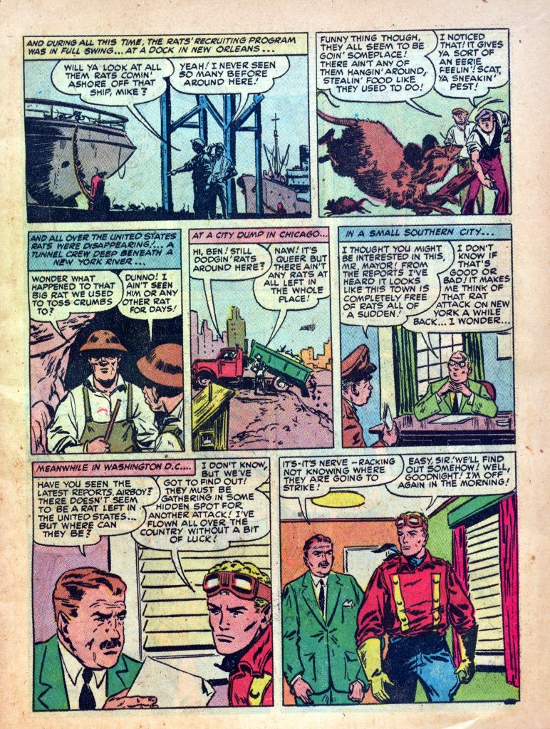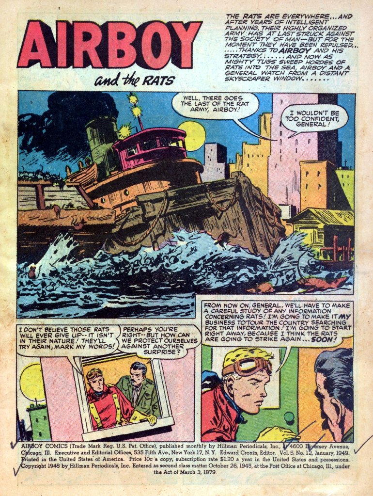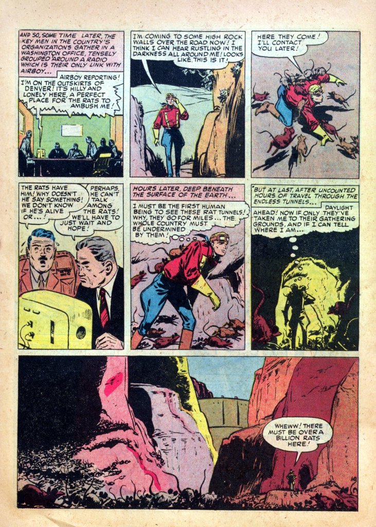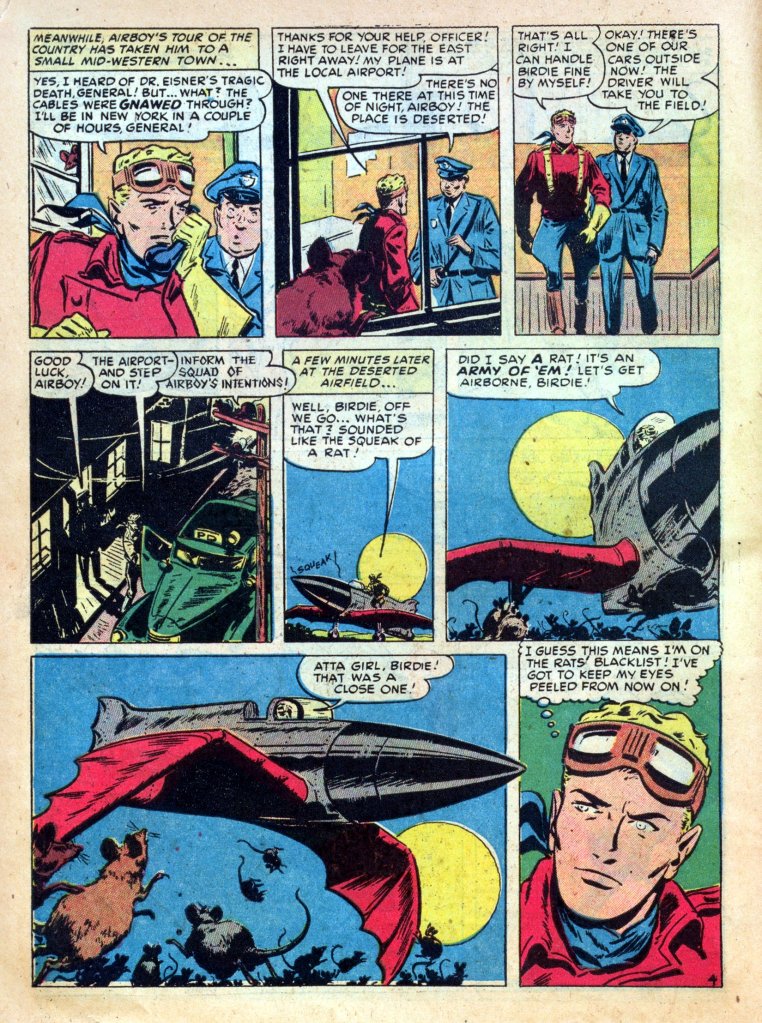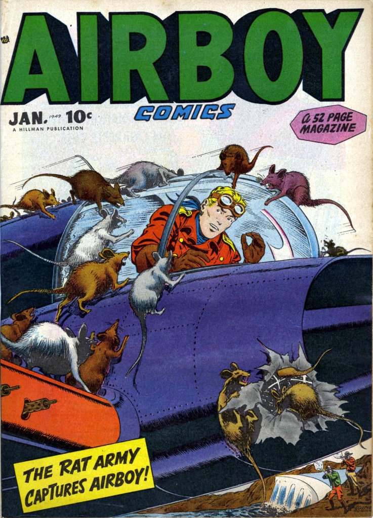 We’re back with a look at the second part of the classic-but-mostly-forgotten storyline in which aviator Airboy battled the threat of super-intelligent rats waging war against humanity. It was a memorable two-part encounter, one that certainly made an impact on the readers of the say. By the time it was published in late 1948, interest in super heroes and aviators was on the wane, and horror was one of the fastest-growing genres in the field. More and more, Airboy would find himself contending with menaces tinged with horror from here on out.
