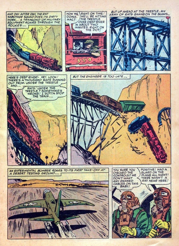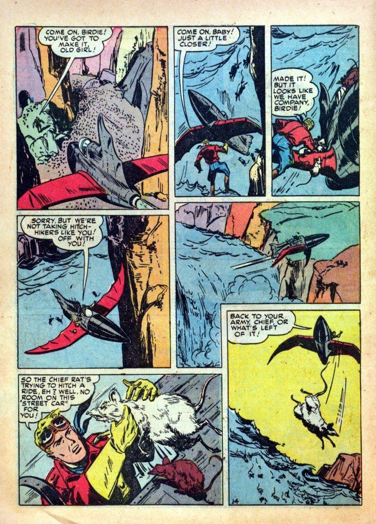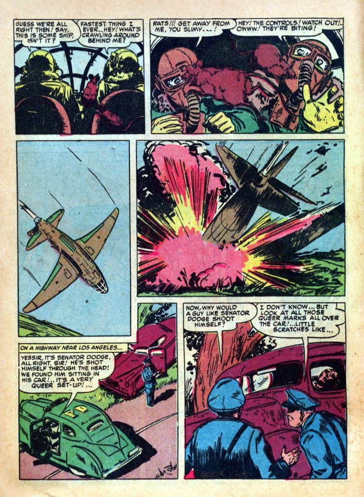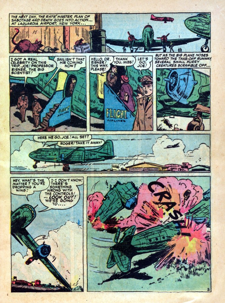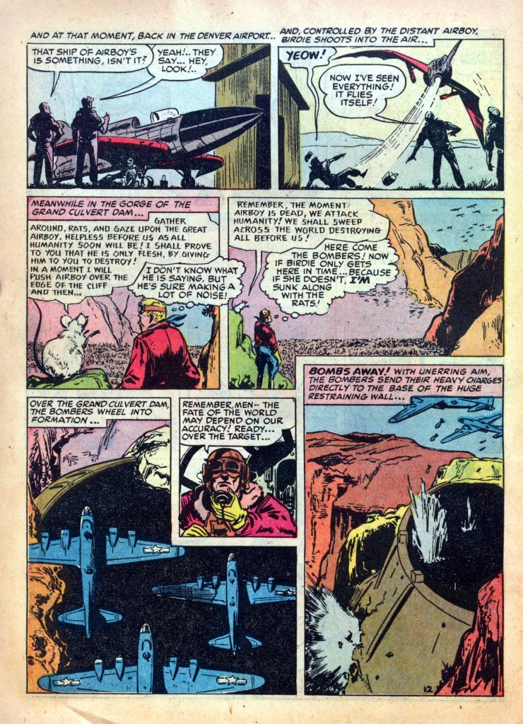 We’re back with a look at the second part of the classic-but-mostly-forgotten storyline in which aviator Airboy battled the threat of super-intelligent rats waging war against humanity. It was a memorable two-part encounter, one that certainly made an impact on the readers of the say. By the time it was published in late 1948, interest in super heroes and aviators was on the wane, and horror was one of the fastest-growing genres in the field. More and more, Airboy would find himself contending with menaces tinged with horror from here on out.