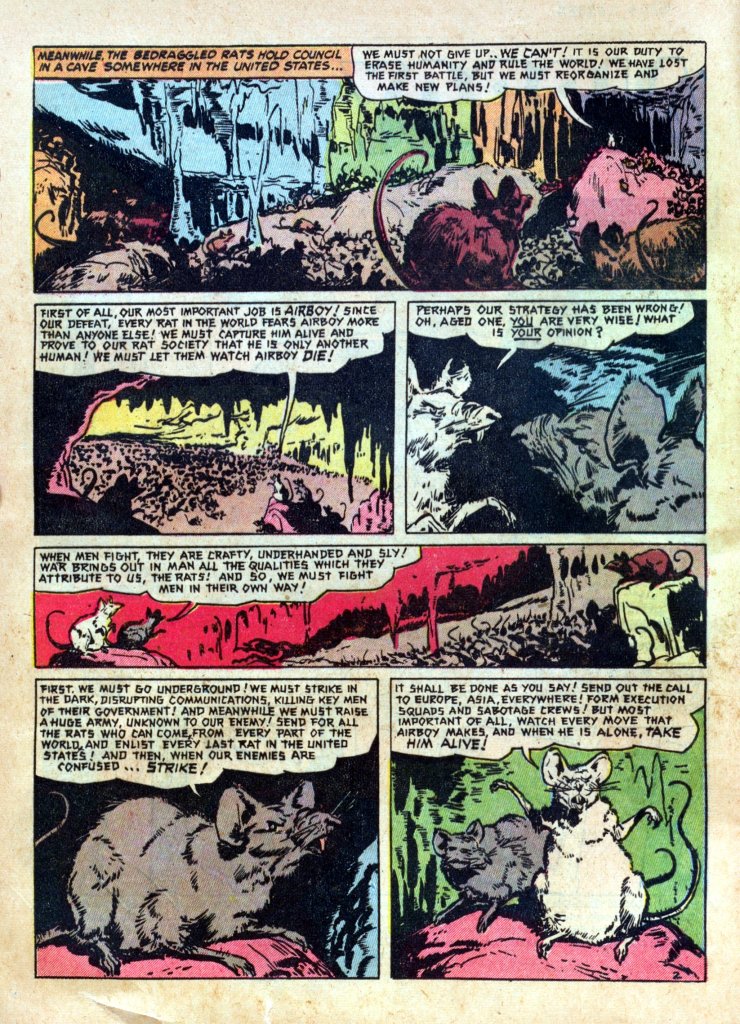 I like the bit where Airboy grasps that the chief rat is doing a supervillain monologue, but “I don’t know what he is saying …”. The lettering when rats speak is nicely done, it visually conveys squeaking.