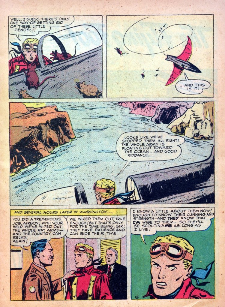 Once again, the story wraps up conclusively, but with a hint towards further similarly-themed adventures. But in this case, that didn’t prove to be the case, and this was the last time that Airboy battled the rats, at least during the Golden Age of Comics. (Years later, his son would contend with the rats again in Eclipse Comics’ 1980s AIRBOY revival.)