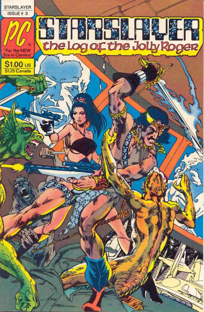 So I bought STARSLAYER right from the first issue, though this is #2 that we’re going to be looking at for relatively obvious reasons. And the ironic thing about it is that I wasn’t especially a fan of its creator, Mike Grell. I knew Grell from is assorted DC work, most notably on LEGION OF SUPER-HEROES. I was also familiar with his popular and long-running series WARLORD. But I never so much as sampled WARLORD–it seemed like it was a barbarian comic book and what I wanted from my comics was always super heroes, so I just didn’t have an interest. So picking up STARSLAYER #2 was driven by a combination of really liking the idea of a new third company and wanting to be there at the ground floor (and not wanting to see early copies listing for exorbitant prices in a couple of years and remembering when I could have gotten them for cover price.)