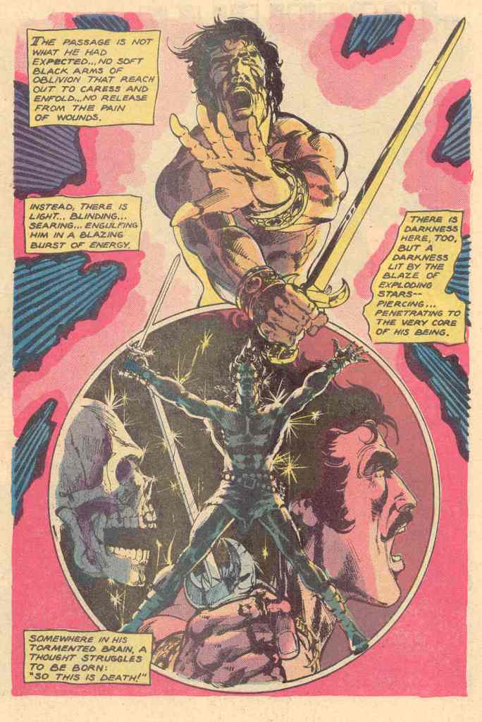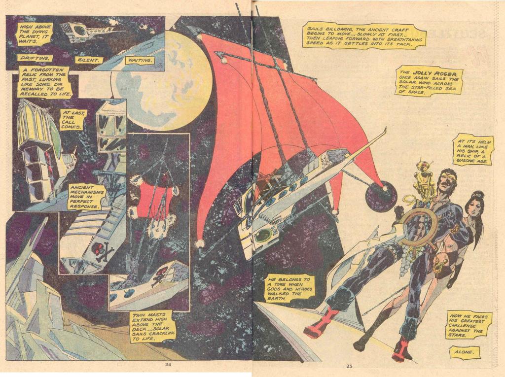 It’s also pirate adventure in space, something that I could wrap my head around a lot more easily, somehow, than barbarians at the Earth’s core. The lettering in this story was often shaky and the coloring was trying for a more fully-realized effect than the usual four-color separations that were then available. But the kinks hadn’t been worked out yet, and so the presentation is a big, uh, sloppy-looking. I had no idea at the time that STARSLAYER had been developed as a property for DC but that it was spiked by the DC Implosion and that therefore Grell took it to Pacific where he could retain ownership and rights to it. It wasn’t a polished presentation at Pacific, but there was something about it that I liked nonetheless. so not a big favorite or anything, but at least a title that I’d continue to follow. And one of the reasons for continuing to pay attention to STARSLAYER premiered on the following page.