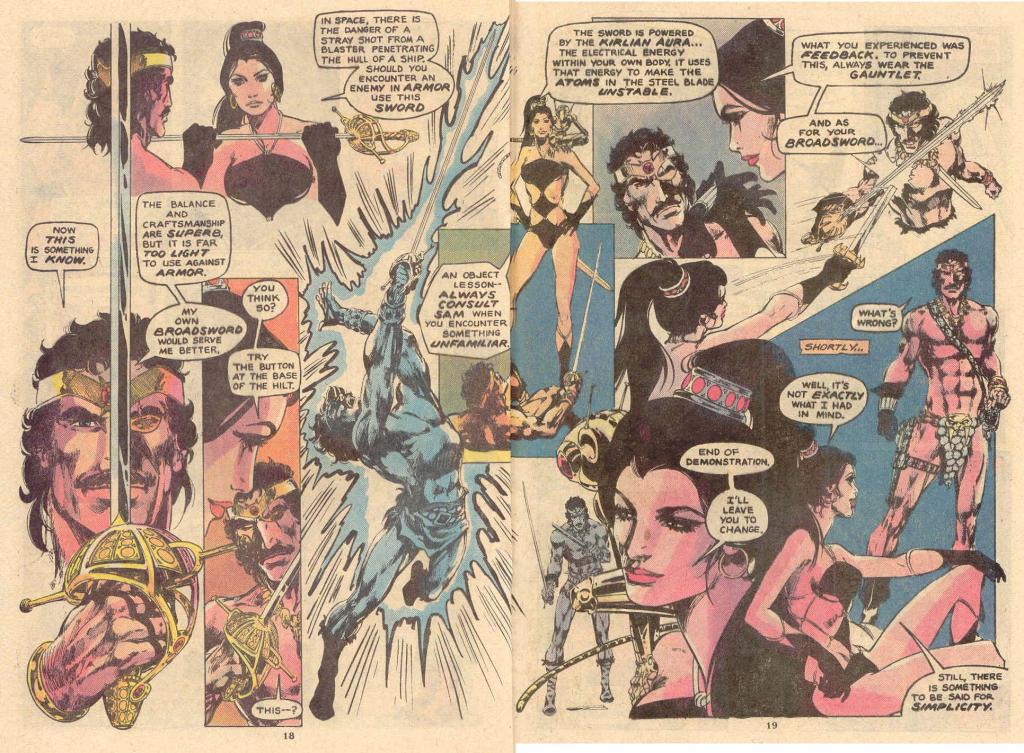 The premise of STARSLAYER was an inversion of Grell’s earlier series WARLORD: in that title, a modern day soldier finds himself in a strange sword-and-sorcery realm secreted at the center of the Earth and becomes a heroic fighter. In STARSLAYER, the lead character, Torin Mac Quillon, is pulled from the distant past at the moment of his death into the far future, a world that needs a heroic champion of its own of the sort that centuries of civilization have bred out of the men of that era. Torin awakens in this issue in this future time and is schooled by Tamara, the woman who has drawn him here, as to what the situation is in this tomorrow time and what they need him to do.