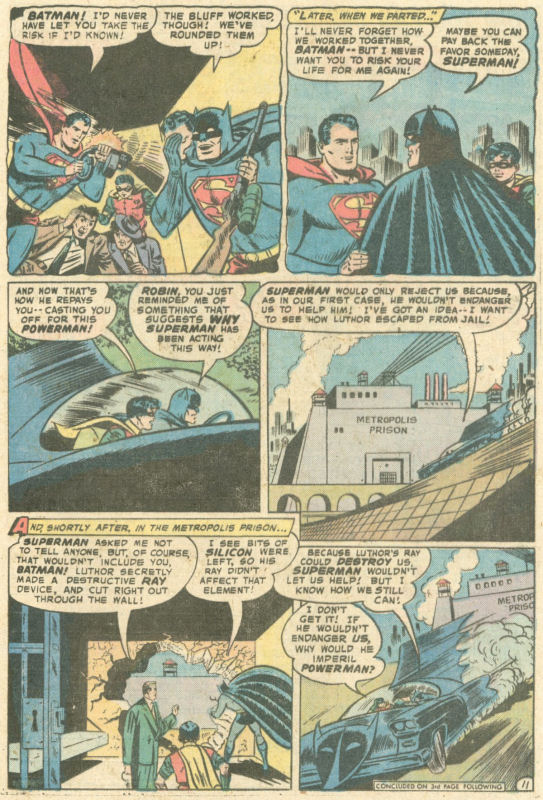 The story opens with a television alert that indicates that superman’s arch-foe Luthor has escaped from prison. Batman and Robin head down to the Batcave, intent on helping their friend recapture the escaped felon, but before they can head out, Superman arrives with another hero in tow–Powerman–and tells the Dynamic Dup that he won’t need their assistance in this instance. In order to keep from confusing any young readers, editor Boltinoff has a yellow oval added to Batman’s costume throughout this story, since it was originally published before that costume-change had taken place. Dejected to have been left on the sidelines by their old friend, Batman and Robin begin to reminisce about the first time they helped Superman out of a tight spot.