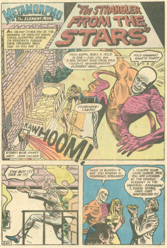 The back-up story in this issue was a random adventure of Metamorpho, probably one that was held over from when Murray had been editing ACTION COMICS and had used the Fabulous Freak as a back-up series with some regularity. Clearly he or somebody liked the character. This one wasn’t a reprint but an original tale, written by Bob Haney and illustrated by John Calnan, as most all of the other Boltinoff-edited Metamorpho stories had been. It kicks off with Rex mason’s employer Simon Stagg declaring that he’s invented a new element, which he called Staggium.