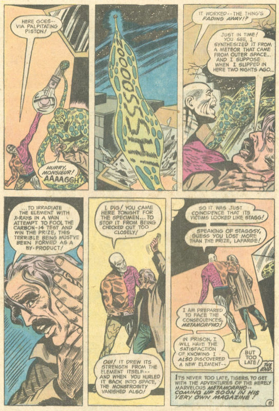 But when Stagg goes to present his discovers to the Science Congress, another scientist, Rene LaFarge, claims that he is the true inventor of Staggium–or as he calls it LaFargium. The two samples are put on display while carbon-dating is run on them to determine which was created first. But after Stagg is pronounced the winner, there are a series of murders in the Science Congress. Metamorpho investigates, suspecting LaFarge–but it turns out to actually be a discorporate creature who lives within LaFarge’s sample of Staggium (or LaFargium). Metamorpho shoots the LaFargium into space, thus getting rid of the attacking creature, and that’s pretty much the ballgame. A blurb at the end indicated that Metamorpho woudl be returning in his own series in the future, but that didn’t happen–though he did headline a single issue of DC’s strange 1970s tryout series 1ST ISSUE SPECIAL.