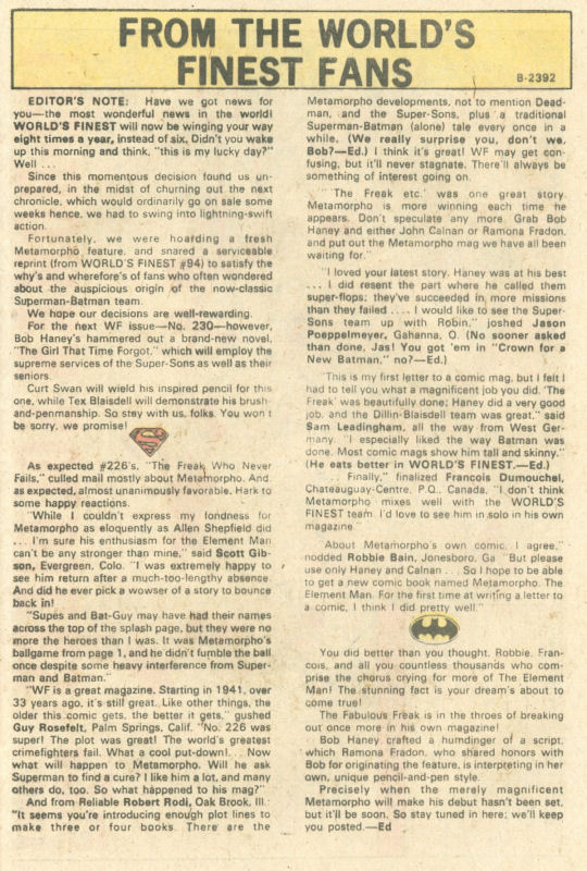 Boltinoff’s From The World’s Finest Fans letters page for this issue is worth taking a look at, in that Murray handled his letters pages differently from pretty much everybody else. Rather than running letters in their entirety, he instead chose to print excerpts. This meant that more readers were heard from in each issue, but also made it feel like the communication was all being heavily censored somehow–like the only opinions that were permitted to see print were ones that Boltinoff in some way blessed, shorn of their original context. Speaking just for myself as a fan, I didn’t like this approach. It was another thing that made Murray’s books feel “wrong” to my young sensibilities, which had been overwhelmingly honed by editor Julie Schwartz’s approach to the material.