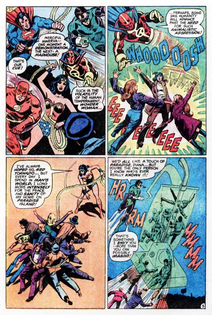 The story opens with the members of the Justice League on trial before the world court. Their crime: unlawfully imprisoning Ultraa after he attempted to take away their super-powers and ability to act in a prior adventure. Ultraa is being represented by Ernest Sloane of the World Citizen’s Defense Society, and he intends to prove that the Justice league acted unlawfully against his client. Out front, there are supporters of the League as well as protestors against the heroes, and as team is led out following a recess, the two groups wind up attacking one another. The League snaps into action to prevent anybody from being injured, then turns itself back into custody. It’s a way to get some action into the opening pages, pretty much.