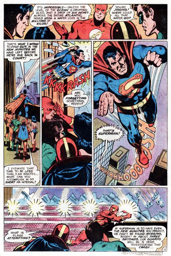 Still in custody, the League becomes aware of events transpiring across the globe. Taking a look with his telescopic vision, Superman notices that the sea level has fallen by almost six inches, which means that a tremendous amount of water is missing. The Man of Steel crashes his way out of the window to go investigate, and his fellow Leaguers conceal his departure–Flash swiftly repairs the glass while Green Lantern uses his power ring to conjure up a stand-in Superman so that the guards don’t realize that the genuine article is missing.