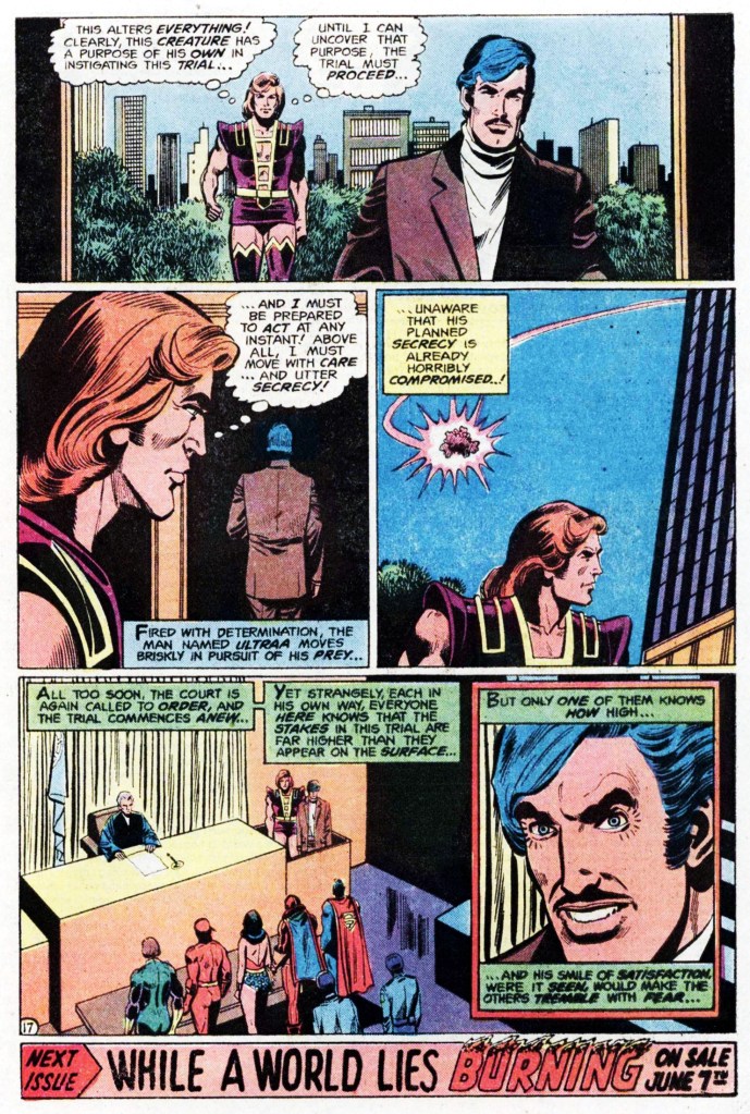 Back at the World Court, Ultraa is beginning to have second thoughts about putting the League on trial, having seen them behave honorably earlier when they broke up the riot and turned themselves back in afterwards. He’s about ready to pull the plug on everything when he happens to spy the Complex creature returning to the area and transforming itself into his lawyer, Ernest Sloane. Figuring that this entity must be behind the troubles on Earth, Ultraa resolves to let the trial continue on until he can determine what is behind everything. But unbeknownst to him, a piece of Complex has seen him seeing them resume their human form, so his attempt to play innocent is already compromised. And that’s where this first part is To Be Continued. Not a whole lot happens, though the idea of putting the Leaguers on trial for having avoided due process and acting unilaterally is a decent one. It’s just that the story deck is stacked against anything but an obvious outcome.