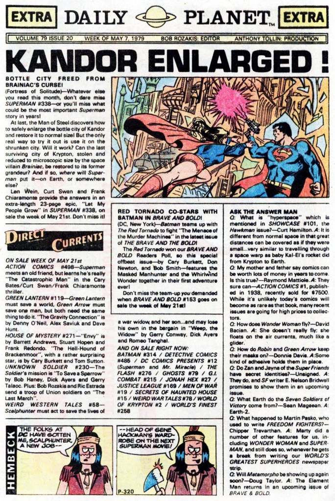 And on the back page, there was yet another edition of the Daily Planet to read, DC’s promotional page, their equivalent to Marvel’s Bullpen Bulletins. The Fred Hembeck cartoon on this one is especially dumb, but Bob Rozakis’ Ask the Answer Man column continued to be entertaining and wasn’t yet completely filled with questions about the value of random back-issues sent in by hopeful fans.