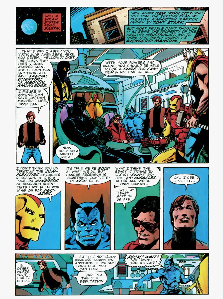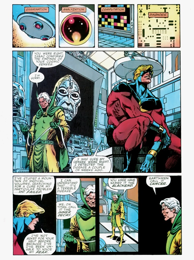 So this book opens with the semi-retired Captain Marvel living on Titan among the relatives of his old and now demised foe Thanos. He’s fallen in love with a woman, Elysius, and settled down to live out the rest of his days. But when he, Mentor and Eros are ambushed by a coterie of Thanos-Thralls who are still marauding despite the extinction of their leader, Mar-Vell finds himself more exhausted by the effort than usual. Mentor offers to run medical tests upon Mar-Vell, but through his Cosmic Awareness, the hero already knows what the problem is: he’s got cancer. years ago, in Starlin’s last adventure featuring the character, he had been forced to seal off a deadly canister of nerve gas that threatened to poison the area. Turns out that while he survived that exposure, it had the long-term effect of giving Mar-Vell cancer.