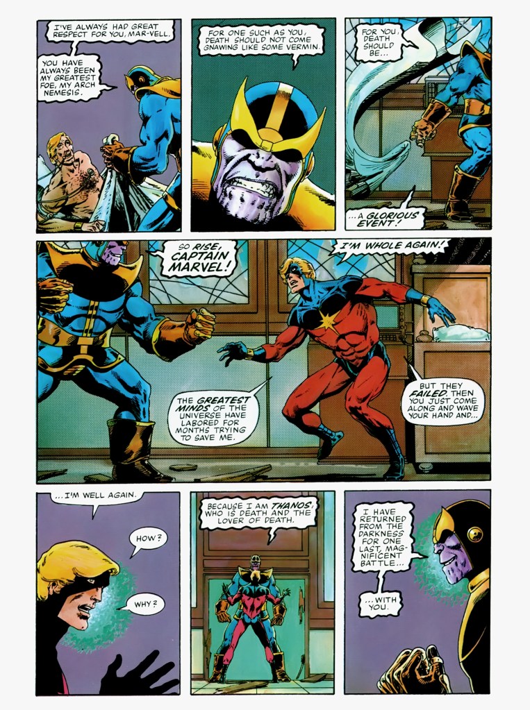 As Mar-Vell’s time grows short, the petrified form of Thanos stirs from where it has stood since the Mad Titan perished and makes its way to Mar-Vell’s side. He restors Mar-Vell’s vigor and tells him that, as his greatest foe, Mar-Vell’s death should be a thing of glory. So he stages one final climactic battle with Captain Marvel, with the fate of the universe apparently at stake and all of Mar-Vell’s deceased enemies joining in the fight. It’s a fitting last struggle, for all that it is all just for show. Because in the end, all men are finite, even men such as Mar-Vell and Thanos, and death comes to them all in the end. Ready to pass on to whatever comes next, Mar-Vell embraces the personification of death, and his life ends.