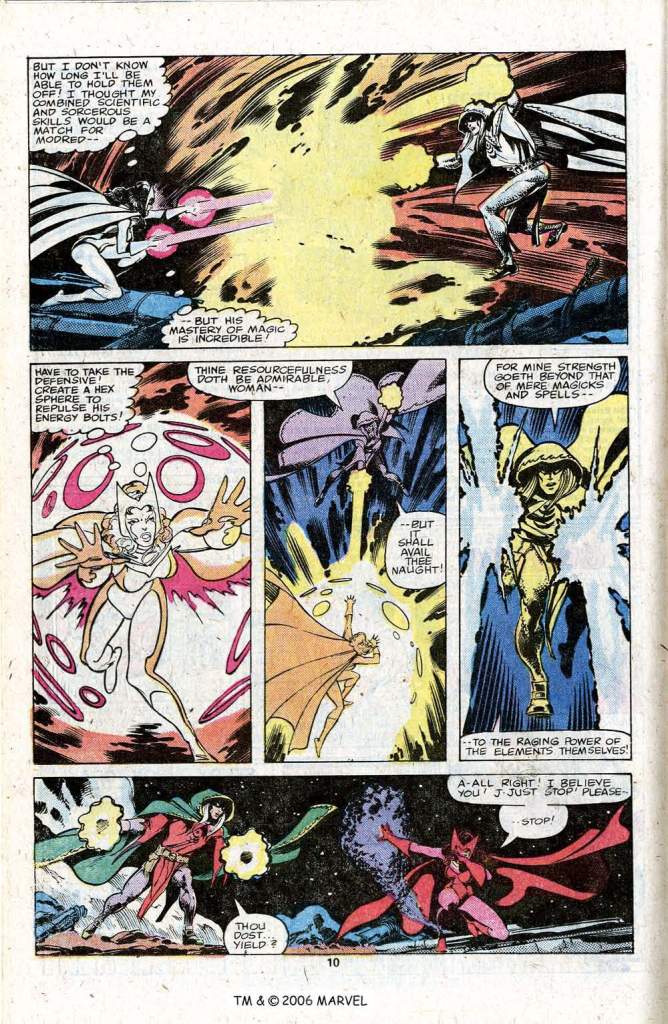 True, it was usually the default of most “controlled heroes” that they at least have a moment where they come back to their noble selves, even if it’s only after being controlled. But as memory serves, in Modred’s next appearance, he’s regressed to childhood for some reason– I guess to make the story (something in MTIO maybe) work out. Admittedly he wasn’t a great conception. But originally he was trying to tap the Darkhold’s power because he thought Merlin in Camelot was corrupted– a detail from Modred’s brief series that I’m not sure ever got explored.