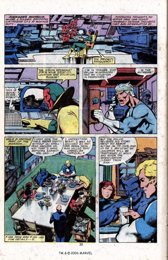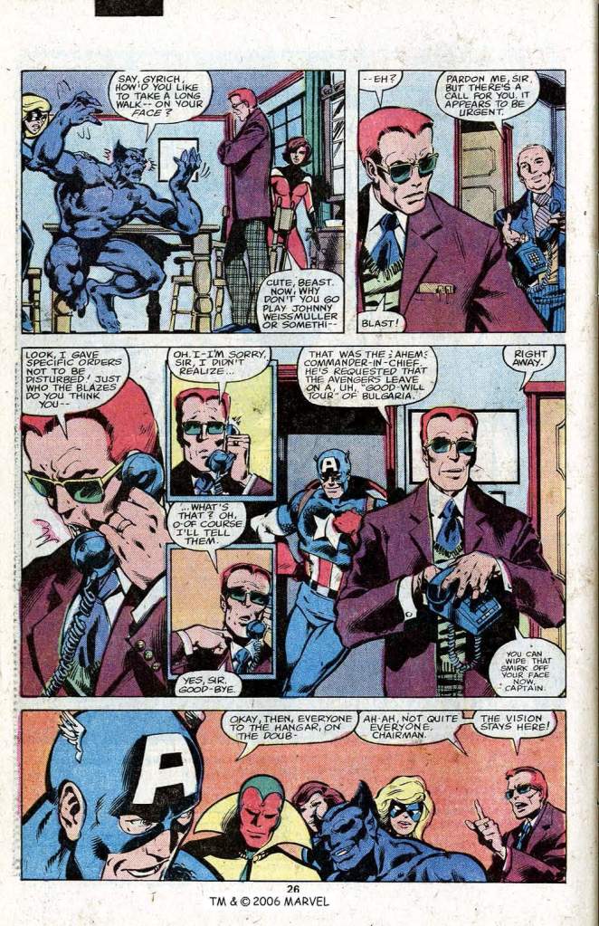 One transatlantic phone call later, the Avengers are ready to fly to Quicksilver’s assistance. But there’s one immediate hang-up: Henry Peter Gyrich, who has been installed as the team’s new government liaison. Gyrich insists that the Avengers can’t simply go halfway around the world and invade the airspace of another country, not without causing an international incident. Gyrich has been a bit of a thorn in the Avengers’ side for a while now, and Captain America decides in this instance that he’s had enough. So the Star-Spangled Avengers places a quick call of his own. And thereafter, Gyrich receives a call from the President requesting that the Avengers immediately embark on a “goodwill tour” of the nation in question. It’s a fun bit of business, back in the days before Gyrich was recharacterized as an evil-hearted bigot.