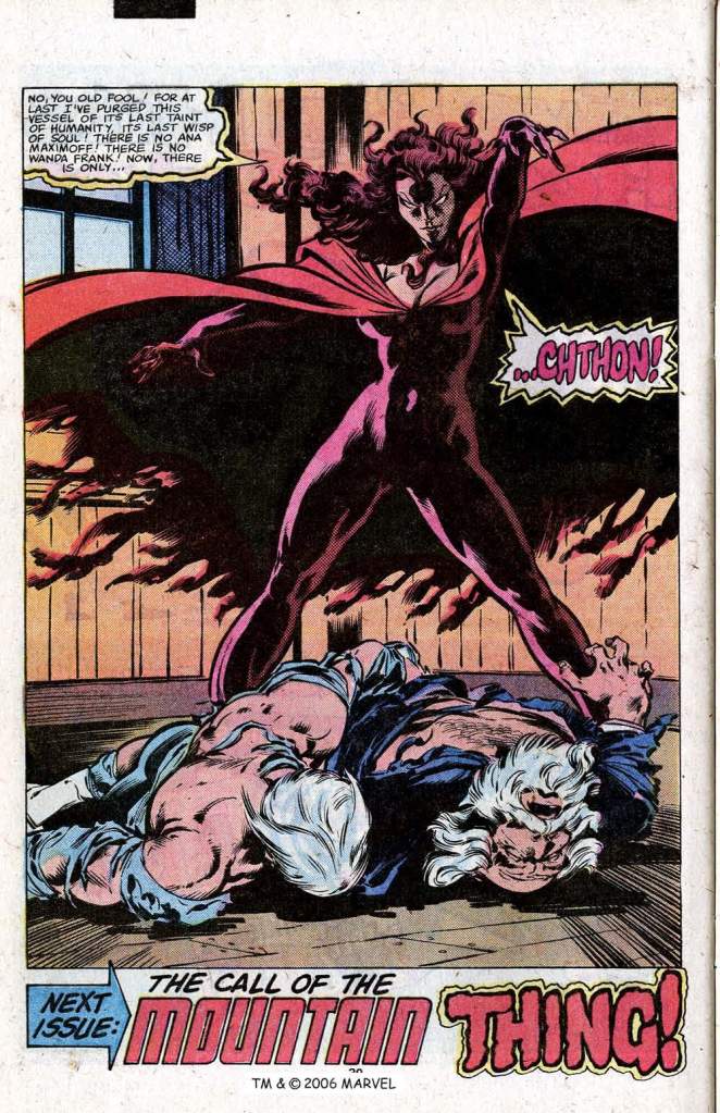 As perhaps a form of retribution, however, Gyrich insists that the Vision remain behind on monitor duty, insisting that the android is too compromised by his emotional involvement with the Scarlet Witch. He’s probably right, as the Vision almost feeds Gyrich his own teeth before Cap convinces him to stand down. Meanwhile, in Transia, Quicksilver and Django aren’t entirely certain that their call was understood or answered. But they are suddenly struck down by a sinister figure that turns out to be Wanda, now completely in the thrall of the demon Chthon. To Be Continued!