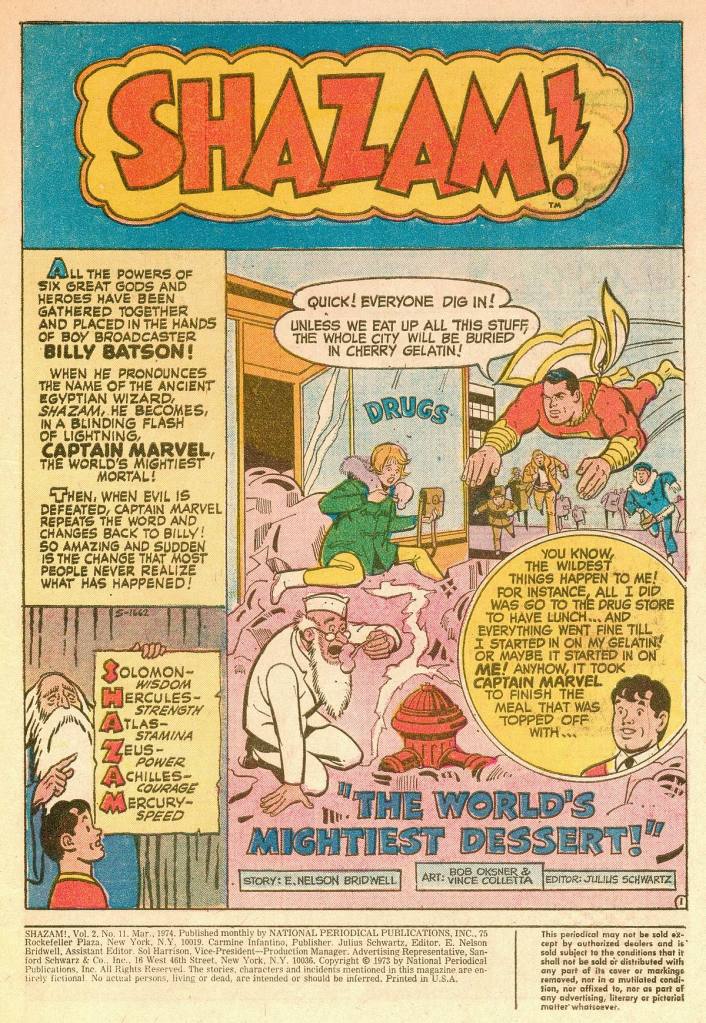 I’m pretty certain that I had owned a copy of SHAZAM #11 at some point. I believe I got it in one of those 3-Bags that could be found in supermarkets, toy stores and department stores, with three comics of recent vintage for a barely-discounted price. I’m also sure that I traded this comic away for something i wanted more, likely with my next door neighbor Johnny Rantinella, who would sometimes get comic books as well. Either way, I came back across it in my read-through of the entire run of SHAZAM courtesy of my friend from school Donald Sims, who loaned me the entire thing one day.