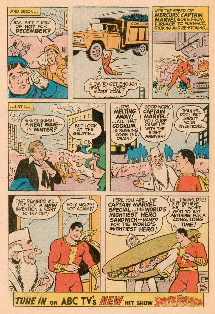 The opener is by E. Nelson Bridwell, who was a fan of the Captain from back in the day, and who over time would come to closest to capturing his essence from those days. it involves counterman Doc Quartz accidentally inventing a gelatin desert that grows uncontrollably, threatening to engulf the entire city. Even the World’s Mightiest Mortal doesn’t possess an appetite large enough to consume all of it, and while he brings in every passerby he can find to help, including some criminals, it just isn’t enough. In the end, though, Marvel realizes that he can melt the gelatin if he can increase the ambient temperature sufficiently, and he does so, eliminating the problem. Nelson drops in an oblique reference on this final page to the Gookum story from MAD #1 from the 1950s–he was a fan with a fiend’s recall for such details.