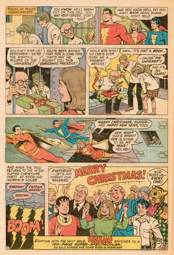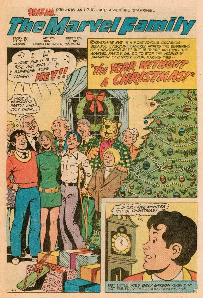 The last story in the issue puts Elliot together with Schaffenberger for a wrap-up to the year of Captain Marvel’s return, 1973. It’s the first all-new story to utilize the entire Marvel Family since the very first issue. But it, too, is pretty silly and underdeveloped. The story takes place on Christmas, with all of the strip’s characters having gathered to celebrate the holidays. But the Sivana Family hates Christmas, and so Dr. Sivana has developed a device that will speed time up, making Christmas pass in about ten minutes. The Marvel’s need to intercede to prevent everybody from losing their holiday.