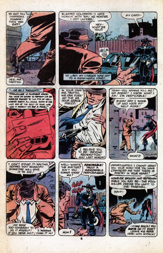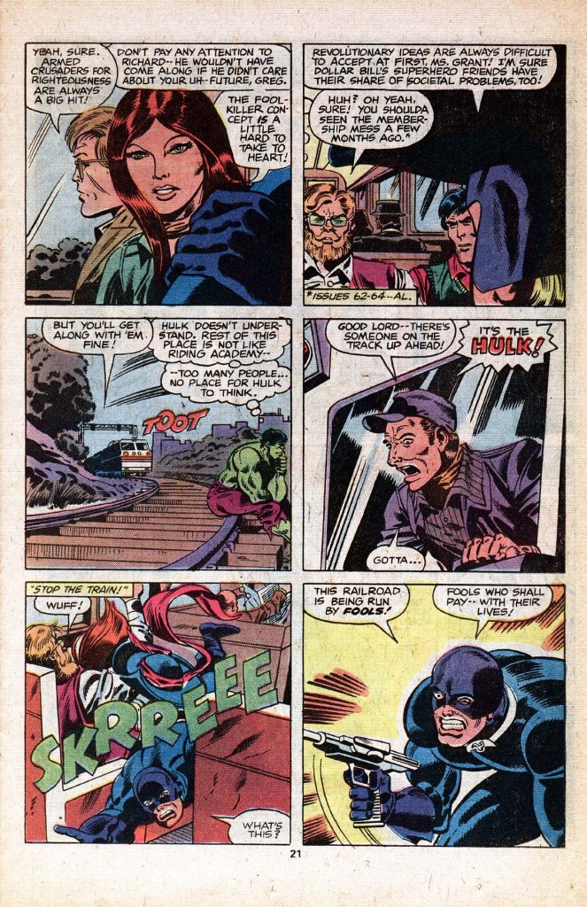 But this is a Marvel super hero comic book, and that means that some action is required before too long. And it takes an unlikely and coincidental form. As Dollar Bill and the Foolkiller–accompanied by Gerber’s other creation Richard Rory for no particular reason–take the train out towards the Riding Academy so Bill can introduce Foolkiller to the Defenders, the train comes to an abrupt stop–it turns out that the Hulk just happens to be sitting on the tracks brooding. The sudden stop jostles Foolkiller’s hat from his head, causing him to get uptight and want to kill the fool responsible. But drawing down on the Hulk would be a suicidal idea, and so Bill is able to calm him down and get him to take his seat once more.