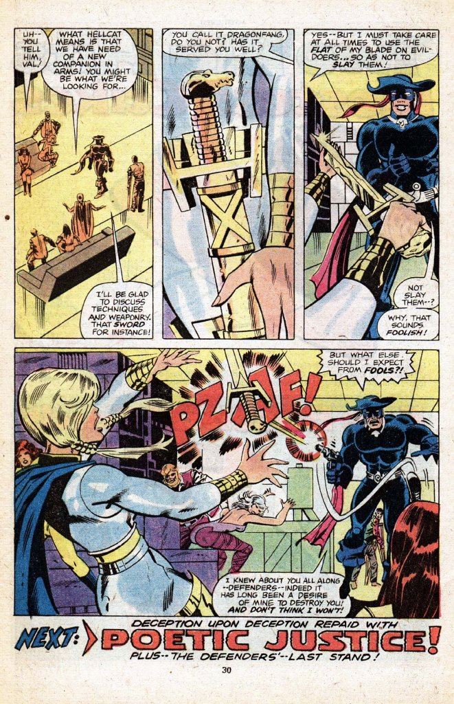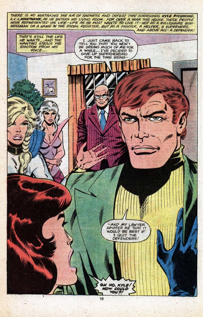 The issue opens with the Foolkiller appearing in the doorway of Professor Turk’s college office, seeking his alter ego Lunatik. Instead, he finds Dollar Bill, a recurring cast member, who hears out Foolkiller’s story and suggests that maybe what he ought to do is to join the Non-Team. And there’s about to be a vacancy. Cutting over to the Long Island Riding Academy that serves as the non-team’s headquarters, we and they are startled to learn that Kyle Richmond, formerly Nighthawk, is giving up his wings. He’s under investigation for his business dealings and given the scrutiny, his lawyers have advised him that he ought to give up his vigilante activities. But he tells his friends that they can keep using the Riding Academy as their hangout if they want to. I don’t know that Kyle’s pronouncement merited a splash page as seen above, though–it’s a pretty dull image to devote an entire page to. Jack Kirby could have made this sort of portrait shot work, but artist Herb Trimpe simply isn’t in his league in this arena.