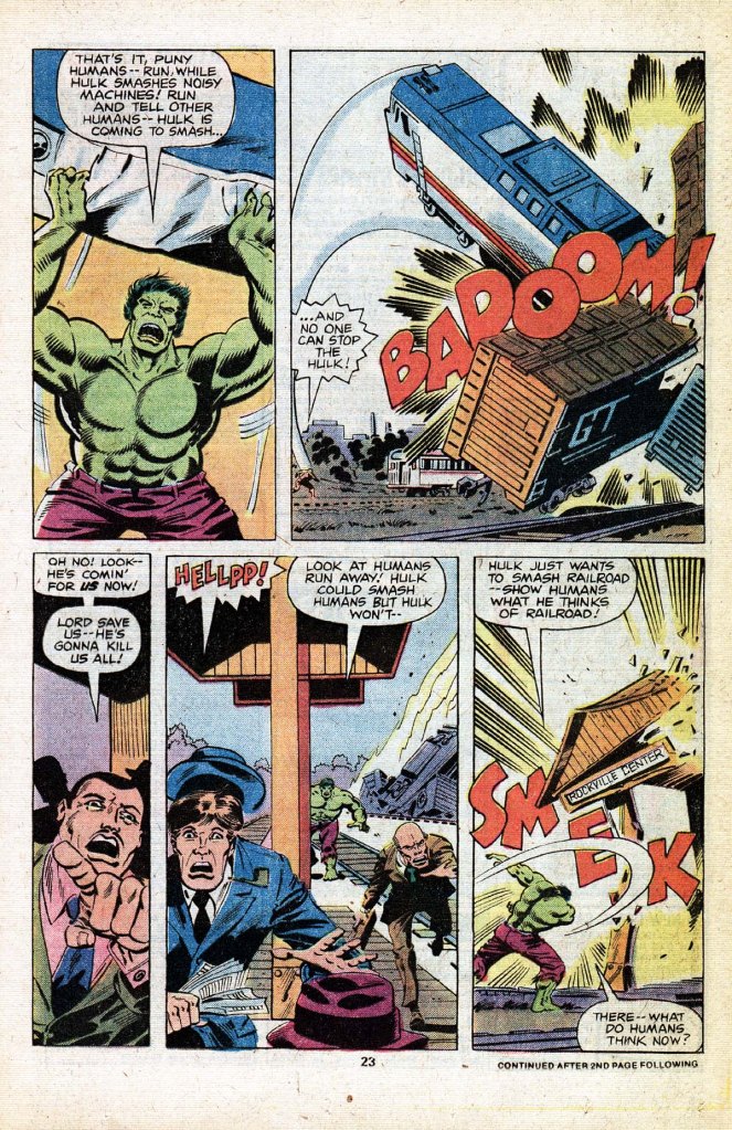 The problem is that the Hulk’s reverie has been interrupted by the arrival and sudden stop of the train, and he’s not happy about it. He picks up a nearby boxcar to throw at the train before thinking the better of it. But he does show off his anger by demolishing the other track and a nearby train station–all to applause of the passengers on the train, who have all had horror stories about commuting on the line. Confused and unsatisfied at the response to his actions, the Hulk decides that this is a good time to exit this particular comic book, and he leaps away. But this whole bit of nonsense adequately checks off the action box for the issue, and so now the story can proceed.