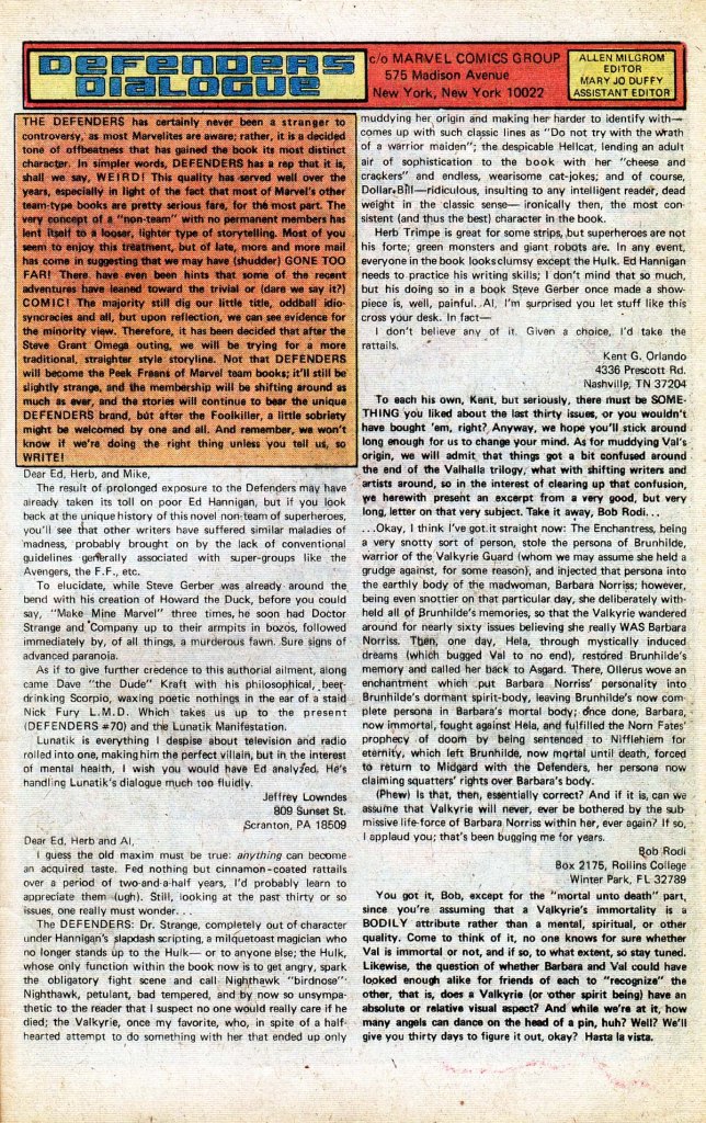 Apparently, enough readers had been writing in about the strangeness of the series (and, I suspect, new Editor in Chief Jim Shooter may have expressed some discontent with the direction of the book) that editors Al Milgrom and Jo Duffy felt compelled to print a message on the letters page guaranteeing that all of this craziness will come to an end in a few short issues’ time, and we’ll be back to having regulation Marvel stories from there on in. They made this attempt, but it didn’t really pan out that way. While the Gerber influence would recede, DEFENDERS remained an off-kilter series all the way to the end of its run some seventy-plus issues down the line. This Defenders Dialogue letters page also included a note from future writer Bob Rodi, a regular contributor especially to DC editor Julie Schwartz’s letter pages. Here, he breaks down what he thinks the deal is with Valkyrie following recent revelations and adjustments made to the character.