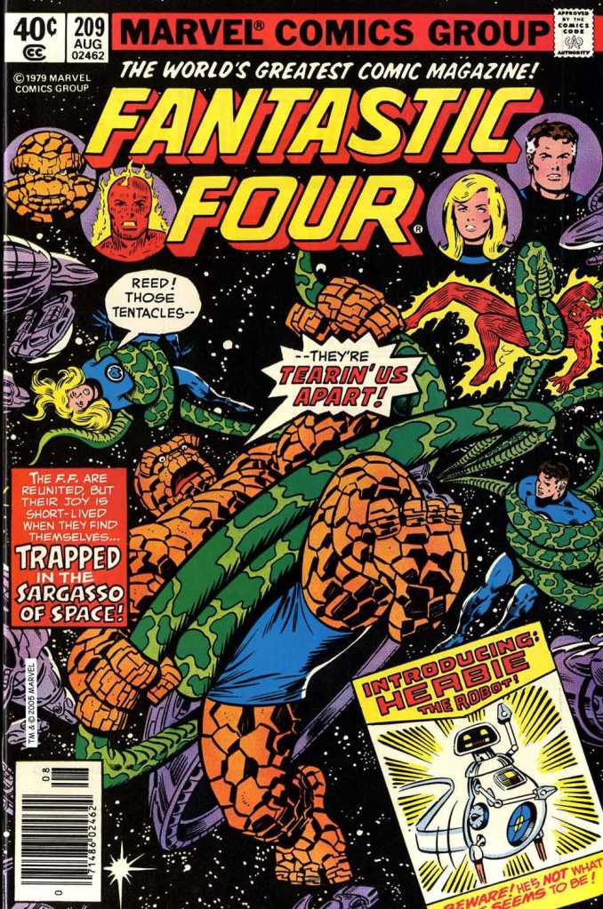 That element, of course, was HERBIE the Robot, a new character introduced into the cartoon series when it turned out that the television rights to the Human Torch were unavailable for animation (they had been licensed for a live action television production that never happened.) Consequently, a new character needed to be devised to take the Torch’s place and fulfill the promise of the premise. And this was 1978, in the immediate wake of STAR WARS, so the shape of that character was obvious to everybody involved: the Fantastic four were about to count among their number a cute R2D2-style robot. It was Jack Kirby who designed the new character–Jack named his creation Z-Z-1-2-3, but that didn’t have the necessary pizzazz for marketing. So he became HERBIE, short for Humanoid Experimental Robot with B-Type Integrated Electronics. No, I don’t know what B-Type Electronics are either, nor how you could take one look at HERBIE and describe him as humanoid. But he got to spar and argue with the Thing, which was his primary story function.