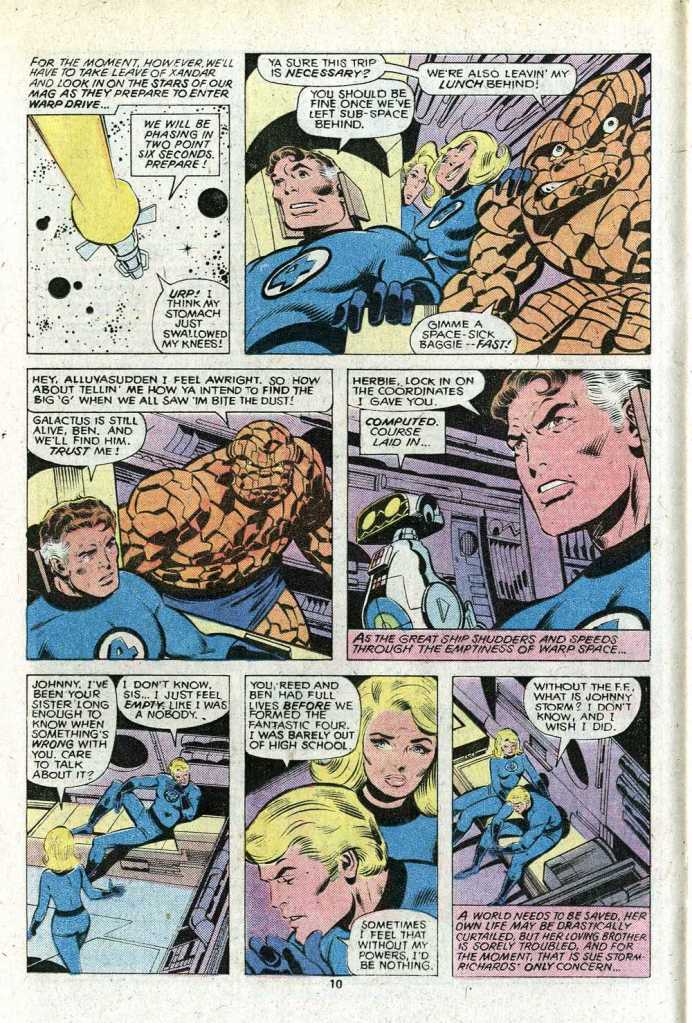 This being Marvel, it wasn’t enough to simply create HERBIE, he needed to be integrated into the comics as well. So in the next issue that I received as part of my subscription, writer/editor Marv Wolfman did just that. The pretext for Reed creating HERBIE is relatively thin–he’s a remote computer terminal that can provide the team with the calculations that they’ll need to navigate across the stars and locate Galactus, their only hope for waylaying the now cosmic-powered Sphinx, who is headed back to Earth to lay waste to it. Marv also includes the in-world explanation that Johnny Storm was out of town the day the contracts for the cartoon series had to be signed, explaining why he was replaced by the little robot. Three of the four members of the FF–everybody except the Human Torch, who arrived later, have been struck by a Skrull aging ray, which has increased their metabolisms, causing them to age at a rapid pace. They’ve only got about three days in which to accomplish their mission before they all perish of old age. So it’s goodbye to Xandar, Nova, the New Champions and that entire wing of this crossover story, as the FF borrow Nova’s starship and head off to locate the world-devourer.